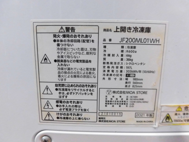中古厨房 マクスゼン MOA STORE 冷凍ストッカー 冷凍庫 フリーザー JF200ML01WH 100V 197L チェストタイプ 上開き キャスター 2021年製