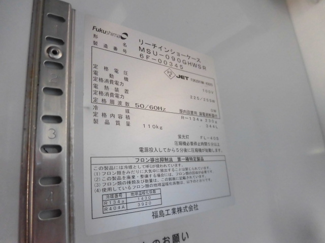 中古厨房 業務用 フクシマガリレイ 縦型 リーチイン 冷蔵ショーケース MSU-090GHWSR 100V 344L 中瓶192本 大瓶160本 スライド扉 照明