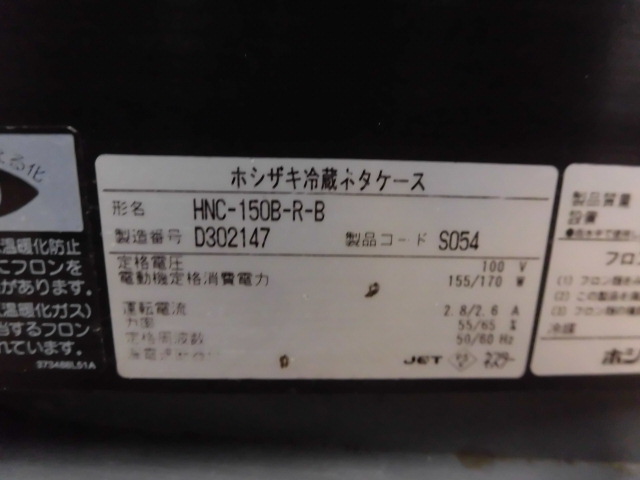 中古厨房 業務用 ホシザキ ネタケース 冷蔵ショーケース HNC-150B-R-B 100V 57L 右ユニット 寿司屋 炉辺 W1500×D345×H270mm 店舗