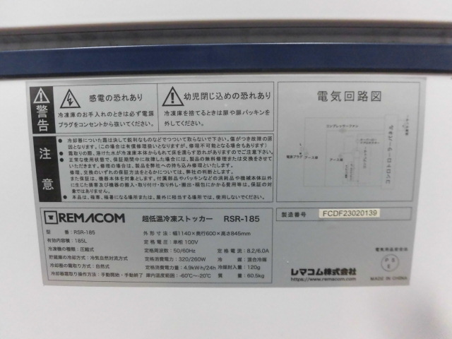 中古厨房 レマコム 業務用 超冷凍 冷凍ストッカー フローズントップ RSR-185 100V 185L -60℃〜-20℃ 冷凍庫 超低温 キャスター 2023年製