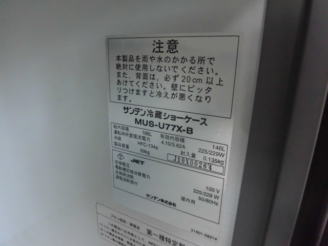 中古厨房 サンデン 業務用 冷蔵ショーケース MUS-U77X-B 100V 146L 0〜12℃ スライド扉 W1200×D450×H800mm 店舗 飲食店