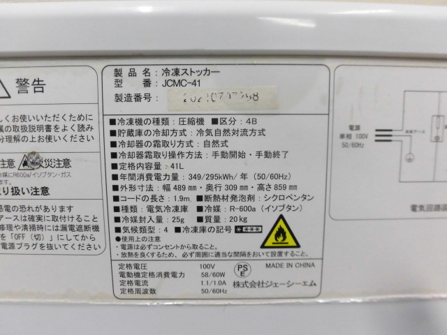 中古厨房 JCM 業務用 冷凍ストッカー 冷凍庫 コンパクト フリーザー JCMC-41 100V 41L スライド扉 W495×D315×H855mm 小型 2021年製