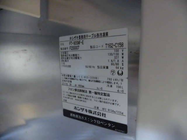 中古厨房 ホシザキ 業務用 台下 冷凍庫 FT-90SNF-E 100V 156L フリーザー コールドテーブル 庫内灯付 W900×D600×H840mm インバーター