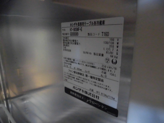中古厨房 ホシザキ 業務用 1ドア 台下 冷蔵庫 コールドテーブル RT-90SNF-E 100V 156L 左機械室 左開き 庫内灯 W900 D600 H800mm 2017年製