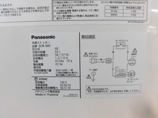 中古厨房 パナソニック Panasonic 業務用 小型 冷凍ストッカー SCR-S45 100V 43L 冷凍庫 フリーザー スライド扉 W535×D320×H865m 2018年