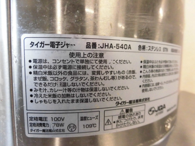 中古厨房 タイガー 業務用 電子ジャー 炊きたて 魔法瓶 ステンレス JHA-540A 4.0L 2升2合 100V 保温専用 ダブルヒーター方式 店舗 飲食店