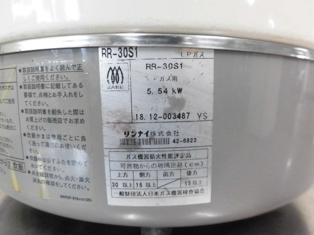 中古厨房 業務用 リンナイ 業務用 LPガス プロパンガス 炊飯器 RR-30S1 3升 6.0L 圧電式 W492×D423×H426mm 店舗 飲食店 2018年製