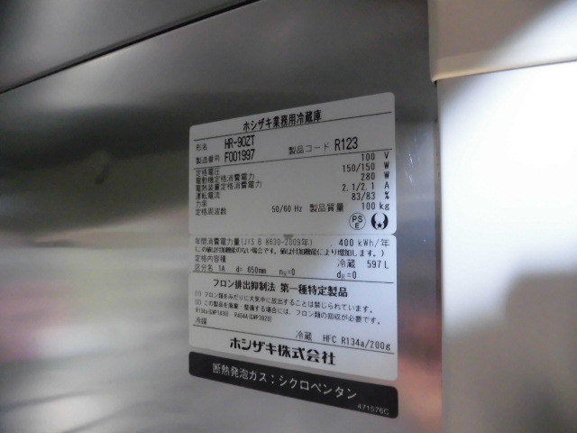 中古厨房 業務用 ホシザキ 縦型 4面 冷蔵庫 HR-90ZT 100V 597L 薄型 省エネ インバーター W900×D680×H1890mm 飲食店
