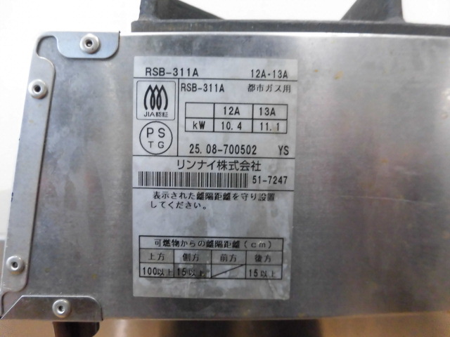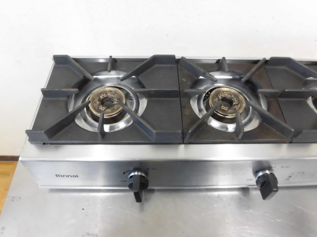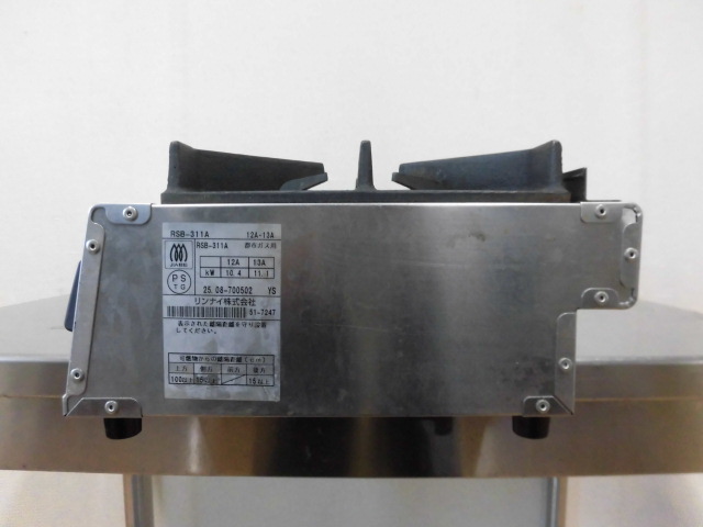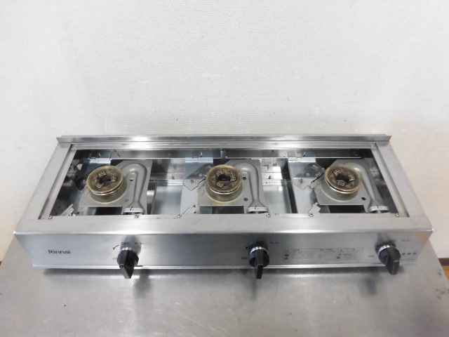 中古厨房 リンナイ 業務用 卓上 3口 ガステーブル ガスコンロ RSB-311A 圧電式 都市ガス 圧電点火 W740×D275(310)×H150mm 2025年製