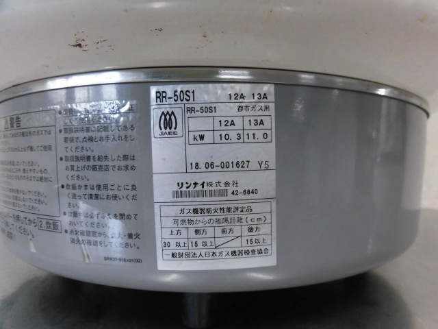 中古厨房 業務用 リンナイ ガス炊飯器 RR-50S1 都市ガス 5.5升 10L 卓上 圧電式 立消え安全装置付 W550×D400×H450mm 2018年製