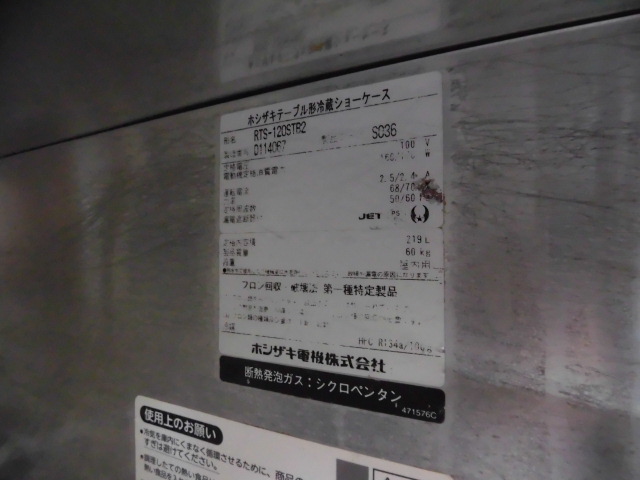 中古厨房 業務用 ホシザキ 台下 冷蔵ショーケース RTS-120STB2 219L 100V 中ビン126本 大ビン118本 庫内灯付 W1200×D450×H800(+30)mm
