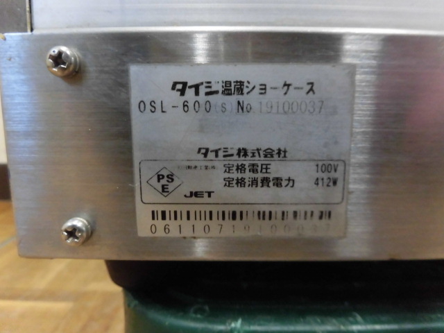 中古厨房 業務用 タイジ 卓上 温蔵ショーケース OSL-600(S) サーモスタット ガラス引き戸 100V 40〜80℃ W600×D430×H520mm 2019年製