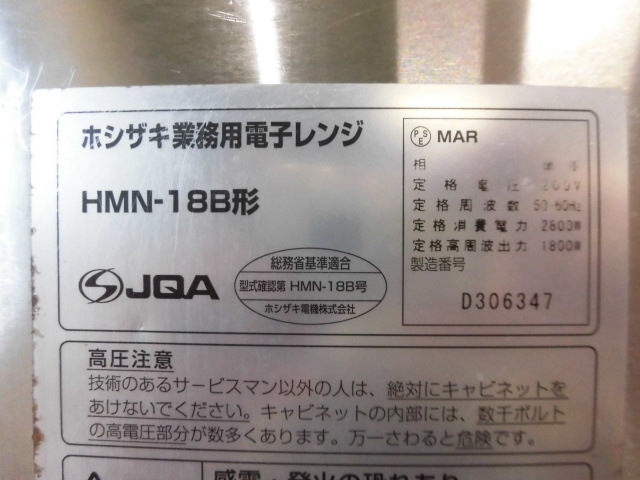 中古厨房 ホシザキ 業務用 卓上 電子レンジ HMN-18B 単相 200V 18L 最大1800W メモリー数30 コンビニ W422×D510×H337mm 庫内灯