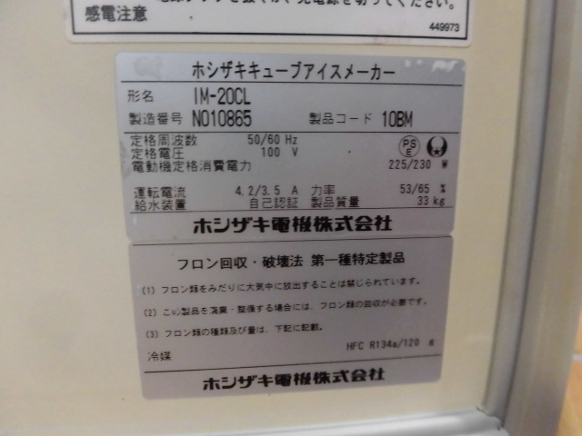 中古厨房 ホシザキ 業務用 キューブアイス 製氷機 IM-20CL 100V 卓上 ICE MAKER20 20kg アンダーカウンター W450×D450×H630mm