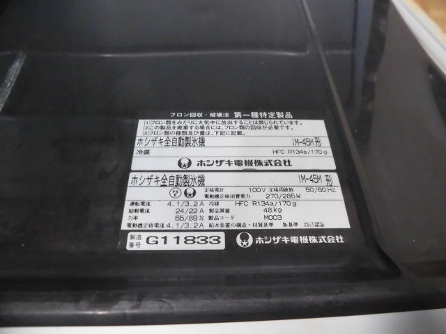 中古厨房 ホシザキ 業務用 全自動 製氷機 キューブアイス アイスメーカー IM-45M 100V 48kg アンダーカウンター W630×D450×H800mm