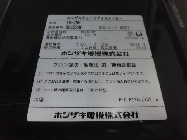 中古厨房 ホシザキ 業務用 全自動 製氷機 キューブアイス IM-25M 100V 25kg アンダーカウンター W400×D450×H780mm