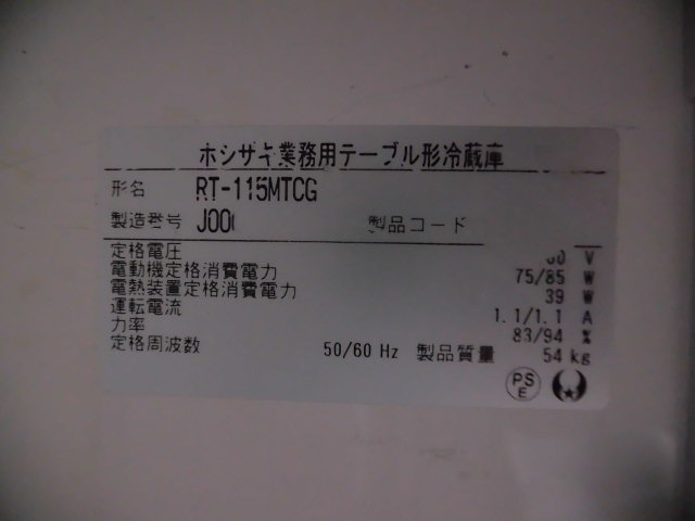 中古厨房 ホシザキ 業務用 台下 冷蔵庫 コールドテーブル RT-115MTCG 100V 155L W1150×D450×H800mm 庫内灯付き ドアポケット 2019年製