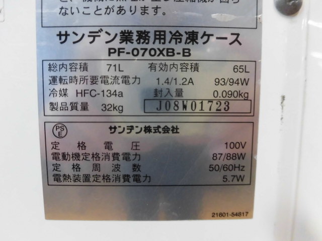 中古厨房 サンデン 業務用 冷凍ストッカー 冷凍庫 PF-070XB-B 100V 50/60Hz 65L 上部スライド扉 コンパクト W700×D310×H890mm