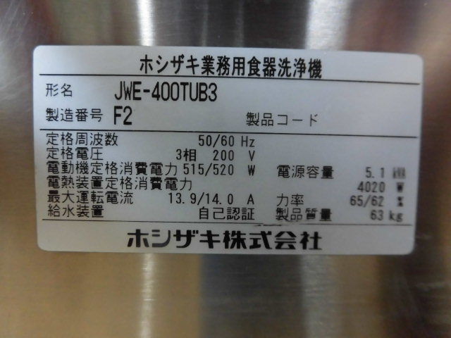中古厨房 業務用 ホシザキ 食器洗浄機 食洗機 JWE-400TUB3 三相 200V 50/60Hz アンダーカウンター 貯湯タンク W600×D600×H820mm