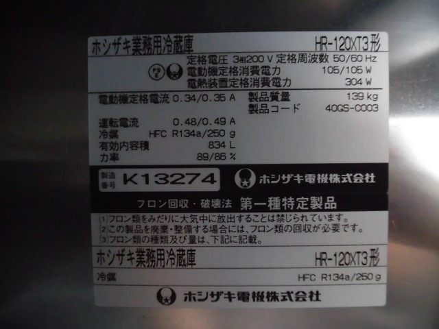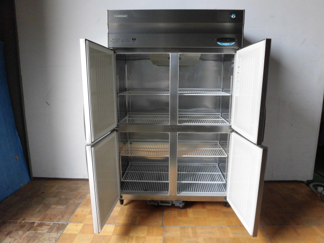 中古厨房 ホシザキ 業務用 縦型 4面 冷蔵庫 HR-120XT3形 三相 200V 834L W1200×D650×1850mm 棚板8枚 店舗 飲食店